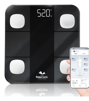 Balança digital que mede peso e composição corporal com bioimpedância via app Bluetooth, oferecendo gráficos e histórico das suas métricas de saúde no celular.